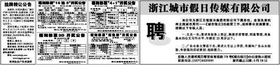 本公司为浙江日报报业集团有限公司下属单位,全面负责杭州主流城市周刊——《城市假日》的经营工作,现因事业发展需要,招聘以下专职人员: