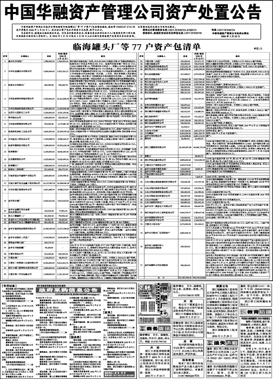 中国华融资产管理公司杭州办事处拥有对临海罐头厂等77户资产(包括债权物权、股权等)43809.67万元(利息计算截至2006年3月20日)。我办拟以资产包公开拍卖方式处置,现予以公示。
