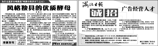 《浙江日报》是浙江省综合类第一大报,广告营业收入已连续2年突破亿元大关,连续10年名列全国省级党报广告营业收入第二位。因业务拓展需要,浙江日报社广告中心从即日起,面向全社会诚招广告经营人才: