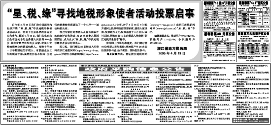 网上投票方式:登陆浙江地税网站(www.zj-l-tax.gov.cn)或浙江在线新闻网站(www.zjol.com.cn)“星、税、缘”专栏。