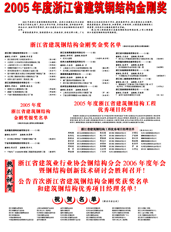 2005年度浙江省建筑钢结构金刚奖,在浙江省建筑业行业协会和有关厅局的支持下,经企业单位申报、专家组考核、省评委会评审、网站公示、组织审定等程序,浙江省建筑业行业协会钢结构分会现予公布。