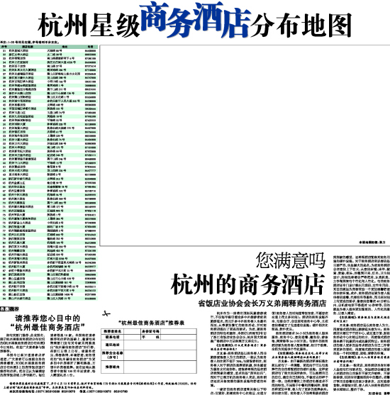 本报今日起开通读者点评通道,广大读者可以根据自身的消费感受,对《杭州星级商务酒店分布地图》上的宾馆饭店进行推荐和点评。把自己认为最满意的宾馆饭店填上序号就行。每位读者限选10家。本报将在读者推荐和点评的基础上,邀请有关管理部门及有关专家共同推选出“杭州最佳商务酒店”排行榜,在浙江日报上公布,使服务优良、待客热情、环境舒适、商务便利的“杭州最佳商务酒店”为更多的中外宾客所了解和熟悉,方便中外宾客选择。我们还将从推荐者中抽取100名幸运读者,每人赠送礼品1份。