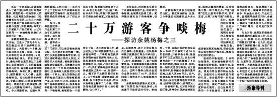 再过一个多星期,余姚杨梅进入了盛产期,如果这时你到余姚来,看到的是一片热闹非凡的景象。杭甬高速公路余姚出口处排着长长的车队,大大小小的旅游巴士都是开往余姚方向;整个余姚市旅馆、宾馆爆满;梅农们几乎家家户户张灯结彩,比过年还热闹……余姚杨梅旅游红火场面可见一斑。