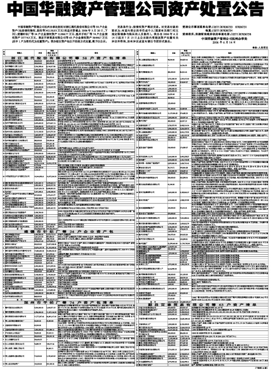 中国华融资产管理公司杭州办事处拥有对浙江现代股份有限公司等58户企业资产(包括债权物权、股权等)42130.53万元(利息计算截止2006年3月20日,下同)、建德针织厂等24户企业债权资产21086.77万元、温州手帕厂等74户企业债权资产25774.3万元、鄞县百事贸易有限公司等63户企业债权资产36446.7万元(其中1户为受托代为处置资产)。我办拟以资产包公开拍卖方式处置,现予以公示。
