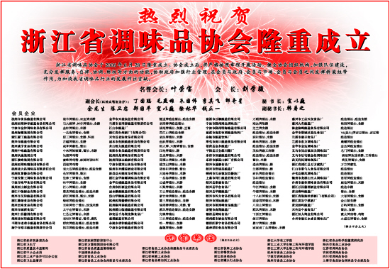浙江省调味品协会于2006年6月28日隆重成立。协会成立后,将严格按照章程开展活动。健全协会组织机构,加强队伍建设,充分发挥服务、自律、协调、维权等方面的功能,协助政府加强行业管理,在会员与政府、会员与市场、会员与会员之间发挥桥梁纽带作用,为加快我省调味品行业的发展作出贡献。