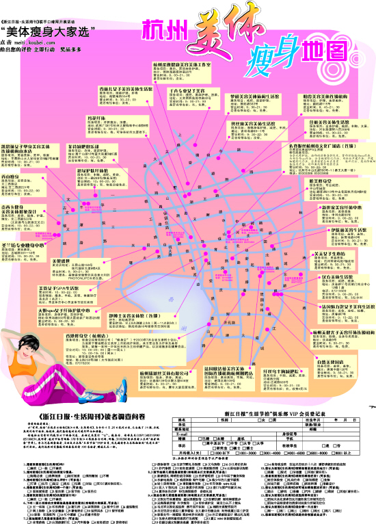 塑造自己的身体,是近年来越来越热的消费需求。虽然杭州美体瘦身机构众多,但还是有很多消费者不知如何获得较为全面的资讯,到哪里有适合自己的美体瘦身服务。为方便广大消费者的选择,促进杭城美体瘦身机构的良性发展,本报推出了这份2006年《杭州美体瘦身地图》,并开通读者点评通道——口碑网(杭州本地会员最多的互动生活信息平台)开展“美体瘦身大家选”活动,请广大读者根据自身的体验,对杭城美体瘦身机构进行推荐、点评,并在读者推荐、点评的基础上,邀请相关专家共同推选出十家“杭州消费者推荐的星级美体瘦身机构”。推选结果将在浙江日报和口碑网上联合公布,从而树立优质美体瘦身机构品牌,方便消费者择优弃劣。