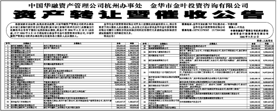 根据国家有关法律、法规及相关政策,中国华融资产管理公司杭州办事处从中国工商银行浙江省分行营业部(原中国工商银行杭州市分行)及辖属支行收购的本公告项下债权(包括担保从债权,利息计至2006年6月20日)及权益,已于2006年8月10日依法转让给金华市金叶投资咨询有限公司,中国华融资产管理公司杭州办事处特公告通知各主债务人及从债务人。