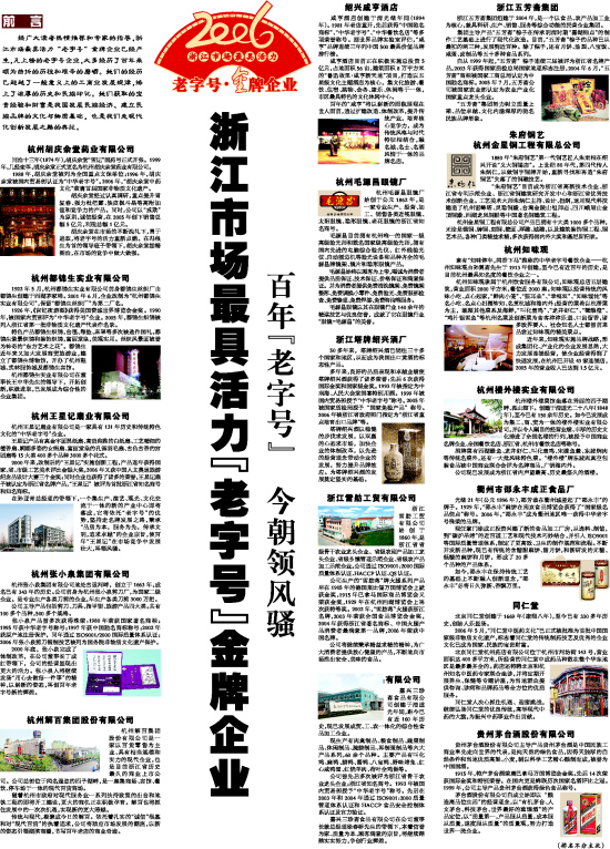 经广大读者热情推荐和专家的指导,浙江市场最具活力“老字号”金牌企业已经产生,凡上榜的老字号企业,大多经历了百年来颇为曲折的历程和艰辛的磨砺。她们的经历已超越了一般意义上的工商业发展规律,烙上了浓厚的历史和民族印记。她们获取的宝贵经验和财富是我国发展民族经济、建立民族品牌的文化与物质基础,也是我们走现代化创新发展之路的典范。