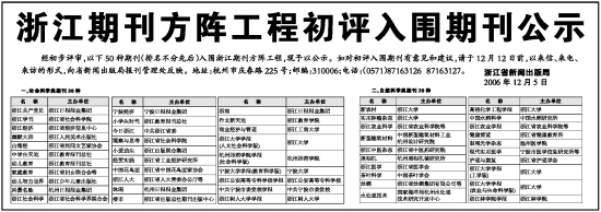 经初步评审,以下50种期刊(排名不分先后)入围浙江期刊方阵工程,现予以公示。如对初评入围期刊有意见和建议,请于12月12日前,以来信、来电、来访的形式,向省新闻出版局报刊管理处反映。地址:杭州市庆春路225号;邮编:310006;电话:(0571)87163126 87163127。