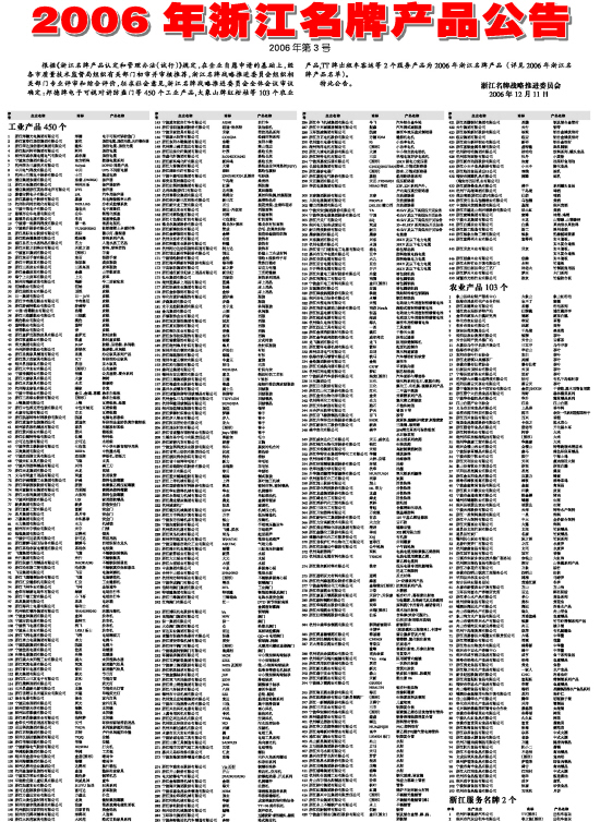 根据《浙江名牌产品认定和管理办法(试行)》规定,在企业自愿申请的基础上,经各市质量技术监督局组织有关部门初审并审核推荐,浙江名牌战略推进委员会组织相关部门专业评审和综合评价,征求社会意见,浙江名牌战略推进委员会全体会议审议确定:邦德牌电子可视对讲防盗门等450个工业产品,大象山牌红柑桔等103个农业产品,TT牌出租车客运等2个服务产品为2006年浙江名牌产品(详见2006年浙江名牌产品名单)。
