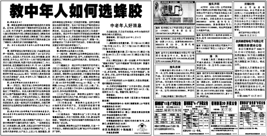 (二)健康处方 南京中科生物研究所的科研人员经过六年的攻关,研制成功了“蜂胶养生宝”,“蜂胶养生宝”是根据中老年人的生理特点,专为中老年人制造的。蜂胶养生宝高效浓缩,少剂量服用效果就好,被中老年人誉为“健康处方”。提醒:蜂胶养生宝不仅仅是蜂胶,它是科学组方,是一个无法仿制的配方(每100克中含总黄酮4300mg,10-羟基-α-癸烯酸:1100mg),所以效果好。目前,北京、上海、广东、厦门、江苏、山东等数十万中老年人自服用蜂胶养生宝以后,身体状态得到改善。