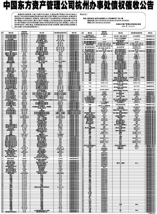 根据法律及财政部、中国人民银行有关规定,中国信达资产管理公司杭州办事处已将其对下列主体享有的债权依法转让给中国东方资产管理公司杭州办事处,各债权所对应的借款合同、抵债协议、还款协议、担保合同项下的全部权利也已依法转让给中国东方资产管理公司杭州办事处,现公告要求下列借款人及其相应的担保人或其承继人向中国东方资产管理公司杭州办事处履行相应合同约定的还本付息义务(若借款人、担保人因各种原因更名、改制、歇业、吊销营业执照或丧失民事主体资格,请相关承债主体清算主体代为履行义务或承担清算责任)。