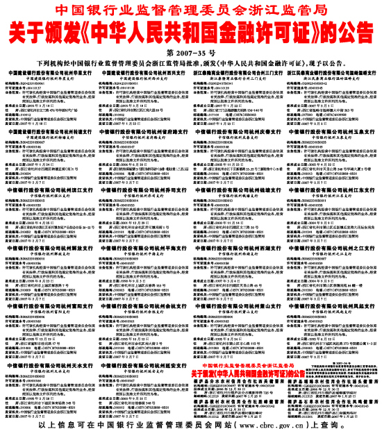 下列机构经中国银行业监督管理委员会浙江监管局批准,颁发《中华人民共和国金融许可证》,现予以公告。