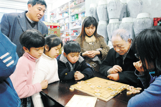 新塘岸村老老少少都喜欢下棋,图为王吕寿(右二)在指导小棋手,周围的邻居都来看。