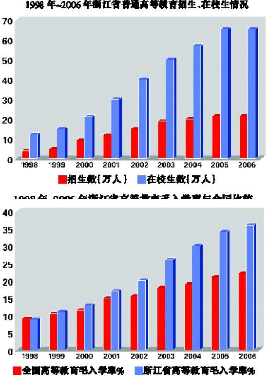 2006年高等教育招生较1998年增长了4.35倍,在校生较1998年增长了4.8倍