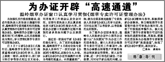 为了提升办证服务理念,温岭市人民政府办证中心烟草办证窗口以“为民便民”作为办证工作的服务理念,窗口人员在办理烟草专卖许可证的工作事项中,热情为办事群众和零售户开展咨询活动和发放宣传资料,深入宣传讲解,进一步引导他们诚信、守法经营,同时对于新出现的问题,以新《办法》精神为指导,积极探索新办法解决,努力缩短烟草专卖零售行政许可审批办理时间,杜绝了行政低效率慢作为,极大地提高了烟草专卖零售许可证行政审批的速度和质量,用高效、便捷的优质服务为办理烟草专卖零售许可证开辟“高速通道”,体现了新《办法》中便民、惠民宗旨。