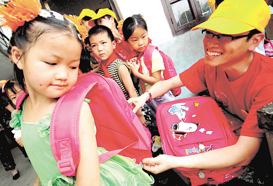 6月27日,奉化育才民工子弟学校的400多名学生,高高兴兴地从爱心志愿者叔叔手中领取了书包等一些学习用品和钙片等营养品。瞧,孩子们正在试选一只大小合适的书包。 记者 吴晓鹏 通讯员 嘉 炜 摄