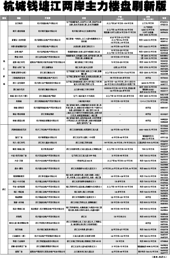 滨江·金色海岸 杭州滨江房产集团股份有限公司 位于钱江新城西南部,西兴大桥(钱江三桥)和复兴大桥(钱江四桥)之间 200平方米—400平方米,其中大部分为380平方米左右的全套空房中别墅户型 26000元/平方米 86800666 86987777