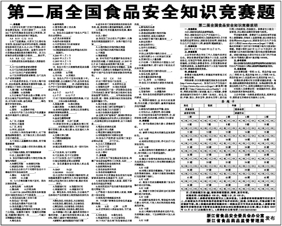 答题说明:1.参赛者请真实填写以上基本信息。2.参赛者须将答案填写在机读卡上,正确做法为用铅笔将您所选答案字母所对应的□涂黑,如需改动,用橡皮擦干净后重新作答。网上答题的参赛者答题完毕一经提交后不可再改动其答案。3.参赛者答题完毕后请将机读卡邮寄至全国食品安全知识竞赛组委会办公室;截止日期为2007年12月15日(以邮戳为准)。4.组委会办公室电话:(010)63525385