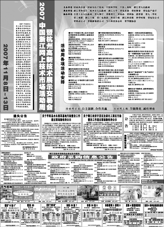 2007中国浙江网上技术市场活动周暨杭州高新技术展示交易会以贯彻落实科学发展观,促进技术创新,调整产业结构,推进节能降耗,推进资源节约型经济增长为目的,以全面展示近年来我省企事业单位获国家、省部科技奖项目和重大科技攻关成果为重点,结合全国和我省近年来的节能降耗技术及产品进行展示交易。在活动周期间,将围绕节能降耗、减排增效这一主题,组织获奖项目和科技攻关成果展示,开展技术转移和交流洽谈,举办循环经济建设技术创新发展高峰论坛、国际科技合作等活动,促进节能降耗新技术新产品的推广应用,推进高等院校、科研院所与企业产学研合作,努力形成市场导向、政府推动、企业和公众主动参与的开放型科技合作格局,积极营造有利于节能降耗的良好社会氛围,促进节约型社会建设。