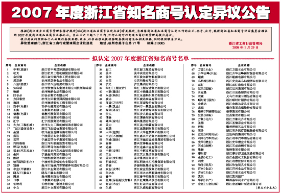 根据《浙江省企业商号管理和保护规定》和《浙江省知名商号认定办法》有关规定,为确保浙江省知名商号认定工作的公正、公平、公开,现将浙江省知名商号评审委员会确认的2007年度浙江省知名商号名单公示。自公示之日起三十日内,任何人均可以向省工商行政管理局提出异议。