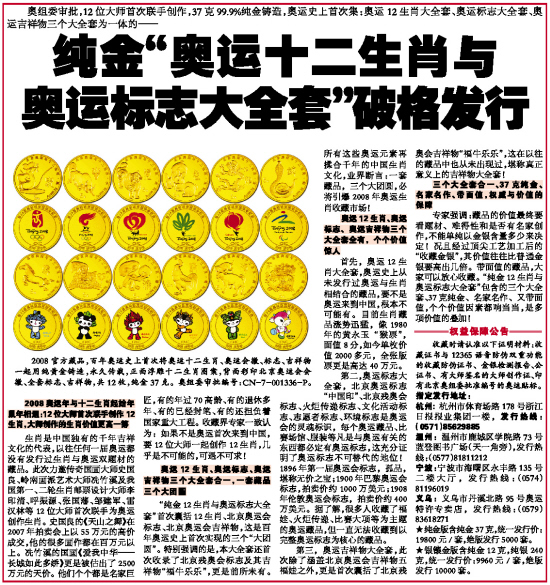 专家强调:藏品的价值最终要看题材、难得性和是否有名家创作,不能单纯以金银含量多少来决定!况且经过顶尖工艺加工后的“收藏金银”,其价值往往比普通金银要高出几倍。带面值的藏品,大家可以放心收藏。“纯金12生肖与奥运标志大全套”包含的三个大全套、37克纯金、名家名作、又带面值,个个价值因素都响当当,是多项价值的叠加!
