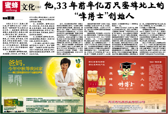 尝到酸甜苦辣、自强不息的顾柏钿,1999年,他创办了以生产、加工、销售为一体的蜂产品加工企业——慈溪市怡康蜂业有限公司。公司的品牌为“峰博士”,企业追求梦想是“怡康蜂业,博士人生”,希望在今后的事业和人生道路上,能有博士的品牌、地位和权威。