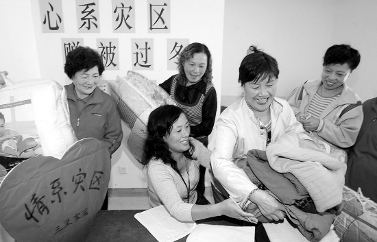 10月13日,杭州三里家园社区工作人员正在登记接收居民捐赠来的被子和衣物。下城区文晖街道各个社区发起了“赠被过冬 情系灾区”大型捐赠活动。 钟昊 郭克 摄