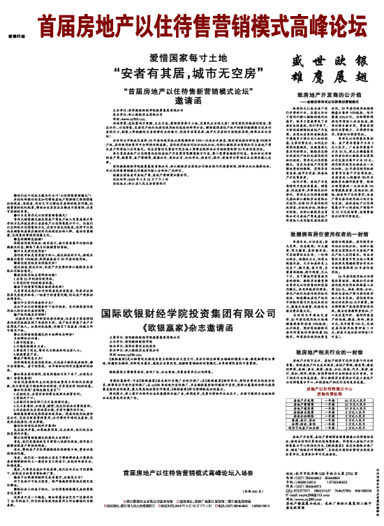 国际欧银财经学院投资集团有限公司、浙江欧银实业有限公司联合国内外投资财团,特举办此次高峰论坛,对以住待售营销模式问题进行深入分析和广泛研讨。