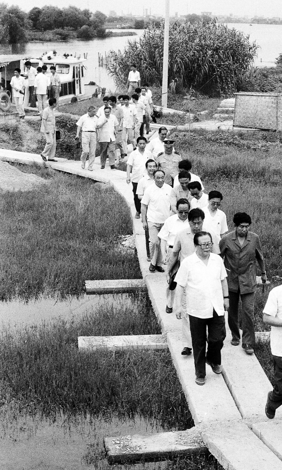 1991年7月8日,江泽民冒着酷暑,踩着水涝中临时铺设的水泥栈道,亲临重灾区嘉善县西塘镇沈道村察看灾情。