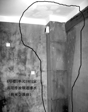 那么,是什么情况导致排油烟道渗水现象呢?一名不肯透露姓名的业主说,由于一楼到顶楼都把油烟排到一个通道里,再从顶楼排出,而顶楼天台排油烟道出口因为雨水进入直接导致渗水情况。“现在只是渗水,如果忽视这个问题,一旦入住,以后渗油就更麻烦了!”