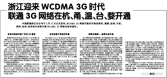 中国联通浙江分公司于5月17日正式宣布,WCDMA 3G网络开通并开始试商用。据悉,杭州、宁波、温州、台州、金华成为首批开通WCDMA 3G网络业务的城市。