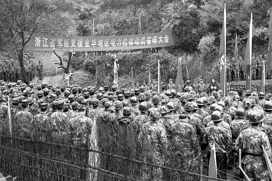 在电力抢修的紧急时刻,省军区迅速集结部队和民兵预备役人员开赴金华,打响电力抢修大会战。
