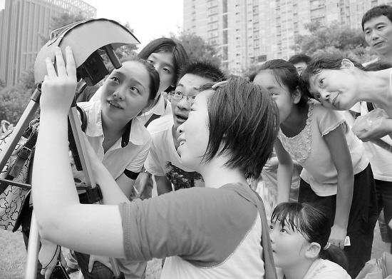昨日,杭州高级中学观测点的草坪上挤满了前来观看日食的市民、学生以及外国友人,不少学生通过自己制作的观测仪器看到日食奇观。