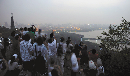 7月22日9点40分左右,日全食使整个杭城成了黑夜,五六分钟后,阳光再次普照大地。