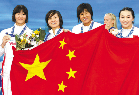 | 左图:中国选手庞佳颖、刘京、朱倩蔚和杨雨(从左到右)在颁奖典礼上。 新华社发 |