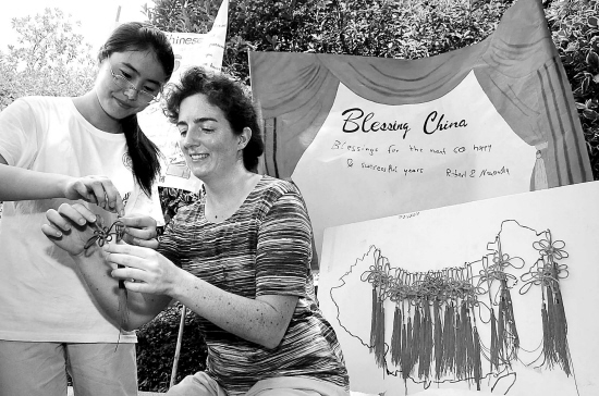 8月1日,一位学生教奥地利游客编中国结。当天,浙江工商大学学生和市民在西湖六公园举行“齐编中国结,同绘爱国心”活动。