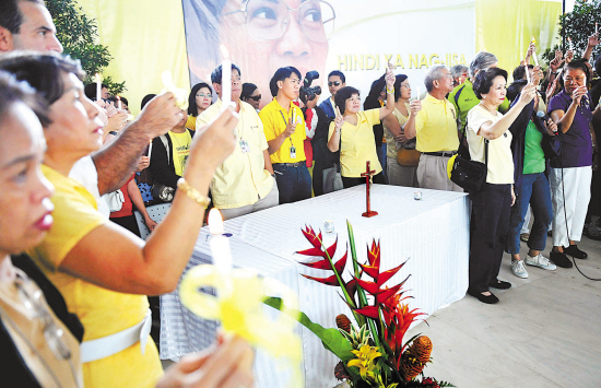 | 图为8月1日,菲律宾人在首都马尼拉手持蜡烛悼念阿基诺夫人。新华社发 |