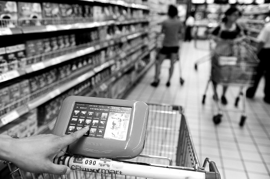 | 8月3日,一种可以为顾客指路的智能导购机出现在杭州一家超市里。10英寸的屏幕安装在购物车的把手处,上面显示超市商品促销信息和一些便民服务信息。屏幕上的促销信息栏,会显示超市里所有的商品打折信息,便民服务栏里有着市区交通路线图、餐饮、酒店等服务信息。 本报记者 梁臻 摄 |