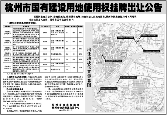 五、本次挂牌出让详细资料请参阅挂牌出让文件。有关挂牌出让文件资料可于2009年8月10日起到杭州市公共资源交易中心(东新路155号和平家私城四楼)B53、54号土地交易窗口索取。
