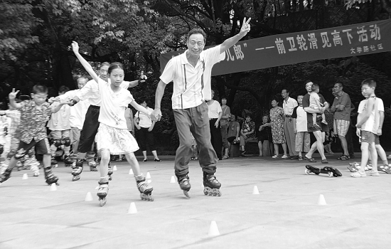 8月3日,杭州大学路社区在横河公园举办“老顽童小儿郎,轮滑见高下”活动,在活动现场,你秀下过桩技术,我来个速滑表演,大家一起体验运动的乐趣。叶寒青 周舟 王艺苗 摄