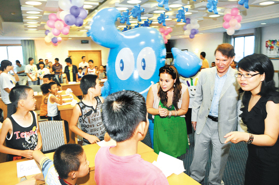 | 8月4日,滕头村2009世博夏令营活动开营。诺丁汉大学金融学教授格斯曾(右二)和他刚从诺丁汉大学毕业的女儿劳伦(右三)应邀来为孩子们授课。外教们通过教唱英文歌曲等,向孩子们传授世博会知识、礼仪常识等。 通讯员 龚国荣 吴培维 记者 周松华 摄 |