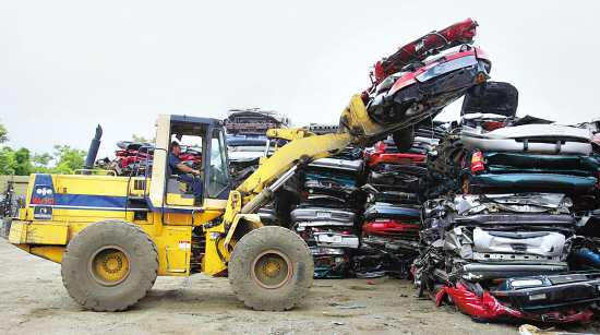 8月3日,在美国密歇根州底特律的汽车供应公司,一名工人正用拖车将报废汽车送进碾碎机。2009年7月,美国市场汽车销量大幅增长,主要得益于美国政府的“旧车换新退税计划”。 新华社发