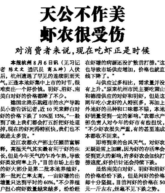 本报杭州8月6日讯 (见习记者 陈文文 通讯员 商玉坤) 入伏后,杭州遭遇了罕见的连续阴雨天气,正逢本地虾集中上市的时节,很难卖出一个好价钱。明虾、沼虾、南美白对虾的价格都降了不少。