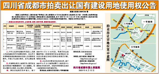 根据《土地管理法》、《城市房地产管理法》、国土资源部39号令以及成都市人民政府《关于进一步加强土地管理的意见》(成府发[2005]42号)文件规定,报经成都市人民政府批准,定于2009年9月4日上午10时,在成都市土地交易市场(成都市国土资源局办公楼附四楼),以拍卖方式出让三宗国有建设用地使用权。现就有关事项公告如下: