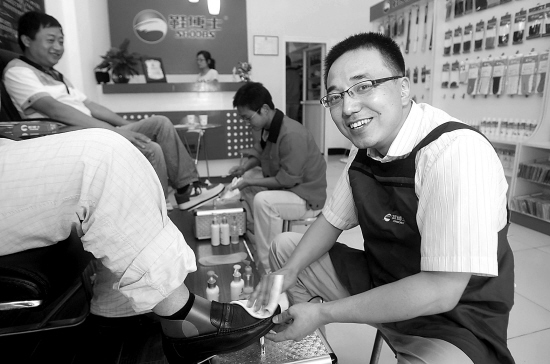 日前,硕士毕业生夏鑫(右)身着工作服正在给顾客擦皮鞋。今年5月,夏鑫与其他两名大学毕业生一起在长兴县合伙开了一家擦鞋店,提供擦鞋、修鞋、保养皮鞋一条龙服务。