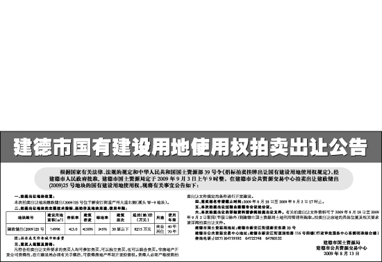 根据国家有关法律、法规的规定和中华人民共和国国土资源部39号令《招标拍卖挂牌出让国有建设用地使用权规定》,经建德市人民政府批准,建德市国土资源局定于2009年9月3日上午9时整,在建德市公共资源交易中心拍卖出让建政储出(2009)25号地块的国有建设用地使用权,现将有关事宜公告如下: