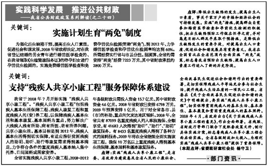 点评:实施“残疾人共享小康工程”,是省委、省政府为建设惠及全省人民的小康社会、全面改善民生促进社会和谐所作出的重要部署,是切实保障残疾人平等地充分参与社会生活,提升残疾人生活品质的一项民心工程。省委在《关于全面改善民生促进社会和谐的决定》中明确提出,要实施“残疾人共享小康工程”,切实保障贫困残疾人的基本生活、基本居住、基本康复和贫困重度残疾人的基本照料。2008年4月,省政府出台《关于实施残疾人共享小康工程的意见》,作出全面部署。省残联、省财政厅等部门联合下发配套政策文件,制订具体实施方案,标志着残疾人共享小康工程全面启动实施。全省各级财政加大投入,为顺利实施“残疾人共享小康工程”提供了重要保障。(本期点评:省委政研室社会处 杨守卫)