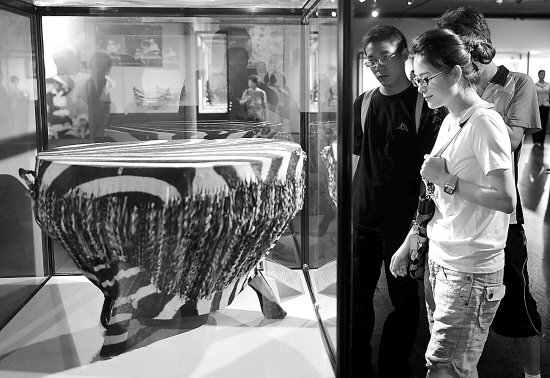| 8月14日,“乐舞缤纷——开国领袖·表演艺术题材外交礼品特展”在北京国家大剧院开展,展览分为魅力舞姿、戏台百味、神秘面具、鼓乐交响、琴瑟抒怀、万千风情6个单元,展出表演艺术题材的国礼精品。参展的175件外交礼品来自5大洲近40个国家,主要是新中国成立以来国家领导人在外事活动中接受的礼品,见证并记录了中国外交事业的光辉历程。图为一名观众在欣赏1974年3月坦桑尼亚总统尼雷尔赠予毛泽东的礼物——斑马皮鼓。 新华社记者 罗晓光 摄 |