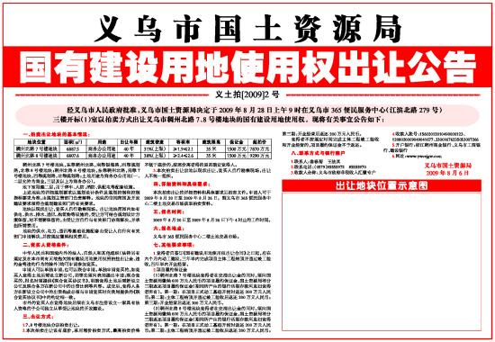 经义乌市人民政府批准,义乌市国土资源局决定于2009年8月28日上午9时在义乌市365便民服务中心(江滨北路279号)三楼开标(1)室以拍卖方式出让义乌市稠州北路7、8号楼地块的国有建设用地使用权。现将有关事宜公告如下: